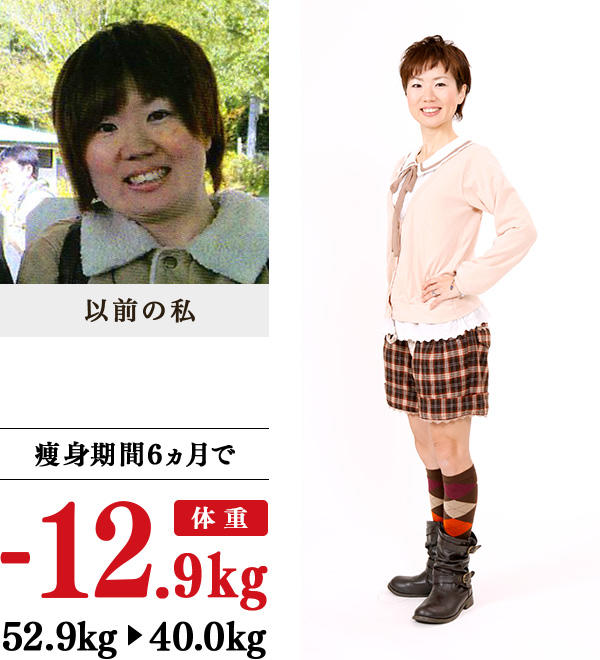 3年前に5kgの減量に成功したことがあるものの、気を許して間食を続けていたら、人生最大体重の54kgに…。年中、ハーフパンツで過ごしていたら、冷えから下半身もたくましくなってしまいました。母や久しぶりに会った知人から、体の変化を指摘され、マズイと思い、予約もせずにイヴへ。飛び込み客の私を先生方は温かく迎えてくださいました。教室では、「これは本物だ!」と思える施術を受け、目標達成のために切磋琢磨する他の生徒さんにも励まされながら、12.9kgの減量に成功し、成人後最軽量に!洋服のサイズは5号になり、お腹のラインが出る服やミニスカートも着るようになりました。水着にもチャレンジしてみたいです。どんな人にも、「痩せたね、痩せたよ」と、いってもらえるのも感激です。新しい自分と出会えました!