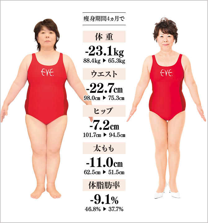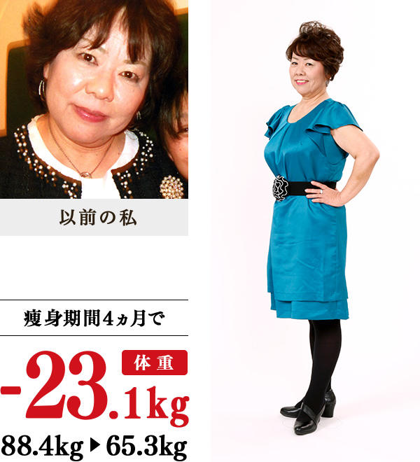 21歳での出産後、体重が増加。今までに数えきれないほど痩身法を行ったけれども、6〜8kg落ちても、それ以上続かず、リバウンド…。ここ20年間、仕事での夜の付き合いも多く、健康面での不安とともに、毎年、洋服が入らなくなる自分にいらだちも感じていました。母や娘、孫のためにも、健康的に長生きしたい、最後の痩身にしようという思いで、イヴヘ駆け込みました。正直、5kg、10kg痩せるだけでは健康になれないだろう、しかも50代の私は、減量は難しいだろうと思っていましたが、23.1kgの減量に成功し、20代の頃の体重に!洋服は、21号から13〜11号に4〜5サイズもダウン。太ももが細くなったので、ズボンが履けるようになりました。間違いなく若返り、精神面での嬉しい変化もありすぎます!