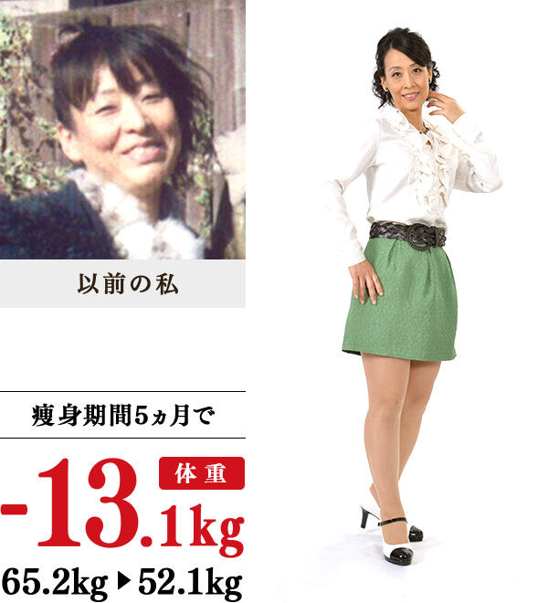 40歳過ぎから、運動不足、子どもにあわせた肉メインの食事、遅めの夕食、長時間の晩酌などが原因で太り始めました。お腹はポッコリ、太い脚には凸凹が浮き出た洋梨体型になり、息切れも生じたため、何とかしたいと思いイヴへ。思うように痩せられない時期もありましたが、そんなときも先生たちの親身な励ましで頑張れました。教室で痩身技術を受けると、1回でも目に見えて体型変化がわかりました。また、家では、食事の時間、アルコール・水分のとりかたなどに気をつけました。夜は乳製品、果物を控え、逆にしょうがや海藻、大豆食品を積極的に食べるように食生活も大改善。わずか通学6回で5kg減し、その後10kg痩せたときには体が軽くなったので、フラダンスのレッスンを復活し、ホットヨガも始めました。20歳頃の体重に戻ったら、更年期のホットフラッシュもなくなりました。