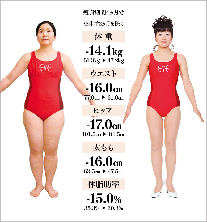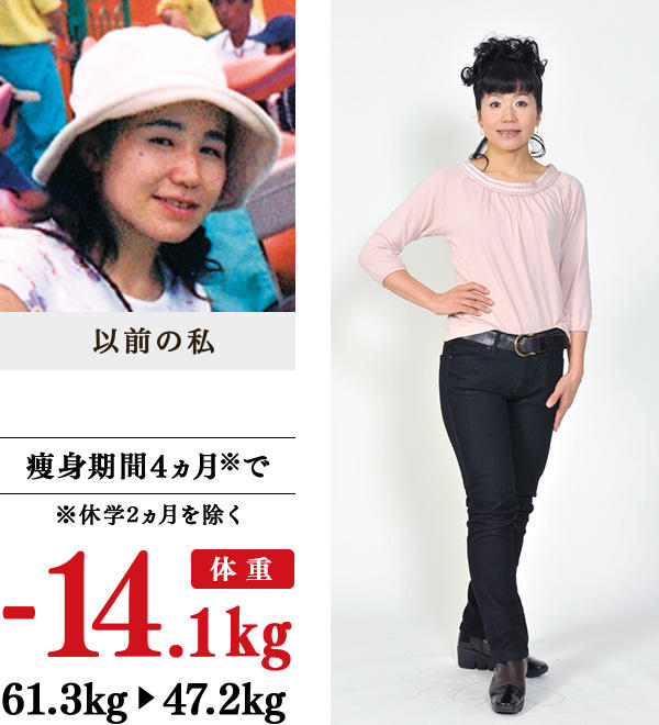 子どもの頃から太め。友人の子に「大根脚」といわれたり、自分でも「この脚、病気?」と思うほど、太い脚でした。運動と食事に気をつけて3kgくらい痩せても、リバウンドで脚がどんどん太くなるため、プロに助けてもらおうとイヴに入学。教室では、「本当に体重が減る、痩せられる」と実感できる施術を受け、家では、温野菜中心の食事と、水分をとり過ぎないように心がけ、ブラッシング体操や半身浴も実行。今では、悩みの下半身が細くなり、サイズは15号から9号に。リバウンド経験あり、三日坊主、根性なしの私でも痩せられました!