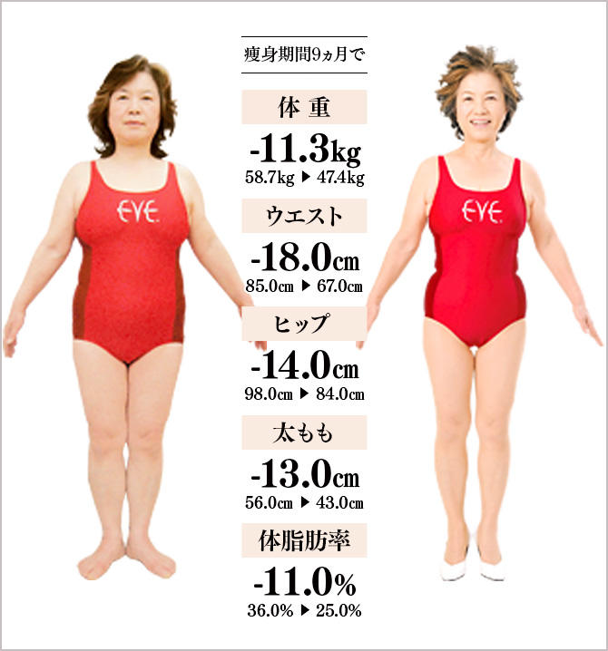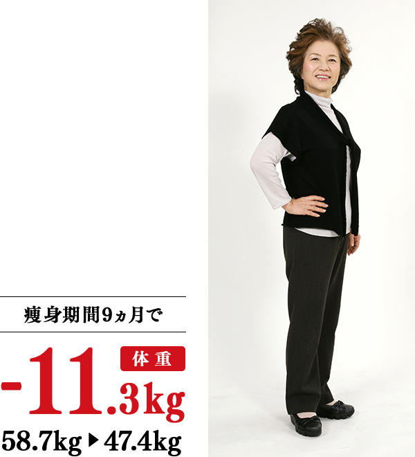 何ごとに対しても意志が弱く、食事制限、軽い運動、エステ通いなどを試しても中途半端で三日坊主の私でしたが、メタボ健診でドクターストップがかかり、真剣にやせることを考えるようになりました。イヴの明るい雰囲気の教室では、先生方の魔法の手と笑顔、楽しい会話に励まされ、家では、大好物の肉や甘い物は先生の指導通りに食べ方を気をつけるようにし、5ヵ月で目標だった10kgの減量に成功! その後のメタボ健診では、健康数値はすべて正常範囲に。これからもイヴで学んだことを実行しながら健康を維持し、お洒落も楽しんでいきたいと思います。