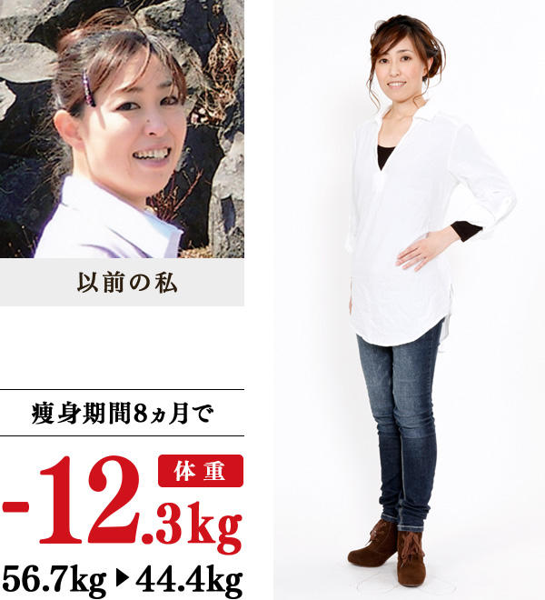 ランチにはデザートを、夕食には味噌汁がわりにカップ麺をプラスという食生活が原因で、29歳頃から体重が増加…。昔と変わらないスタイルを維持している友人や、以前、私より体重が多かった友人が、痩せてキレイになった姿を見て、本気で痩せようと決意しました。教室での施術プラス、家では、野菜中心の食事や、夕食よりも昼食にボリュームをおくよう心がけ、ブラッシング体操は下半身を重点的に行うなどのアドバイスも実行。痩せたら、太ももにすき間ができ、全身SサイズがOKになり、ショートパンツやミニスカートが履けるようになりました。