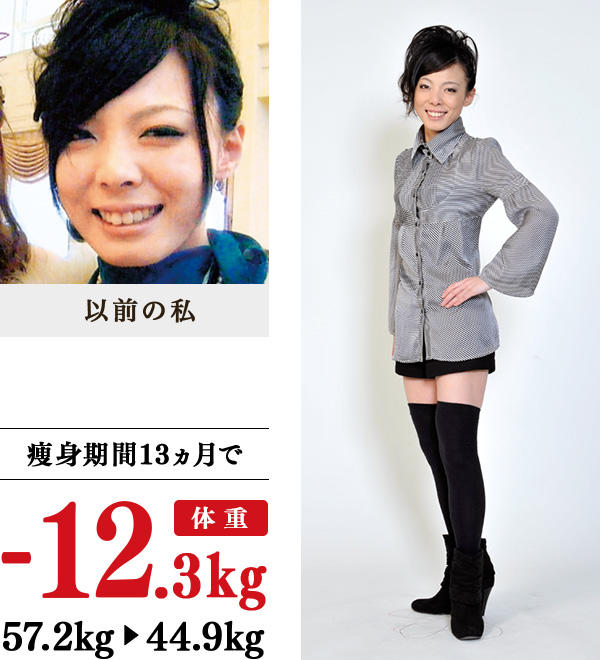 着痩せするタイプだったため、薄着になるのが怖く、夏の海水浴のお誘いは断る始末…。このまま周囲の人や、自分をだまし続けてはいけない、自分を変えたいと思い、イヴに入学しました。通い始めると、体重がすぐに落ち始め、下肢のむくみや冷えもスッキリし、プロ技はスゴイ!と実感。ホームケアのアドバイスも丁寧で、難しくなかったので、食べる順番を考えたり、半身浴とブラッシング体操を実行したり、十分な睡眠をとるなどを自宅で実践。目標以上の減量ができ、7号の脚見せファッションも楽しめる理想の体型を手に入れました!また、肝機能と肌荒れも改善し、イヴ入学は今までの不健康生活を変えるきっかけとなり、心も体も健康になることができました。