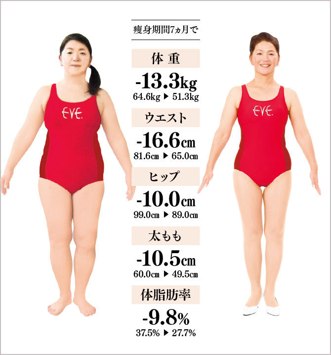 2年前に膝に怪我をしてから、大好きなテニスができないストレスと食べ過ぎで、10kg以上体重が増加…。医師にも、「膝のためにも減量を」といわれ、健康やせのイヴに入学しました。施術を受けると、1回で1.5〜2kg、多いときは3kgも体重が落ち、最初の1ヵ月で6.1kg減、3ヵ月で10kg減!家では、きくらげやレバーをよく食べるようになり、半身浴やブラッシング体操などのアドバイスも実行し、減量に成功!痩せたら、膝痛、腰痛がなくなり、肌までツヤツヤで、化粧のノリもよくなりました。洋服はウエストゴム入りの15号からフィット系9号に激変。以前のように体を動かせるようになったので、再び、テニスの試合に出たいです。
