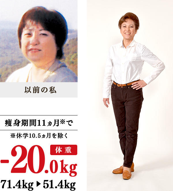 出産後、徐々に体重が増え、3ヵ月くらいダイエット食品を試して1〜2kg痩せたけれども、長続きせずにリバウンド。イヴヘは、娘の卒業式にスーツを着たくて通い始めました。会話も楽しめる教室で施術を受け、家では、食事量バランスを朝0:昼5:夜5から朝4:昼4:夜2に変え、野菜を多く食べ、食事をよく噛むようにも心がけました。ブラッシング体操も実行したら、最初の1ヵ月で5.4kg減し、娘の卒業式には念願のスーツが着られ、「次はあの洋服!」と夢が広がりました。さらに痩せたら、血液検査のデータがよくなり、肌荒れも減少。洋服は、ウエストゴムの17号から9号のスパッツなどに激変し、イヴで第二の人生がスタートできました。