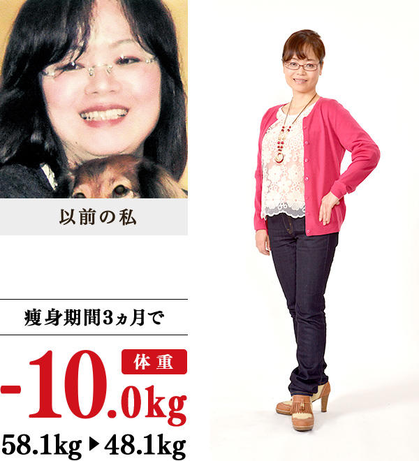 脊柱管狭窄症にかかり、ほとんど歩けなくなったことと禁煙が重なり、どんどん体重が増加。腰のためにも痩せようと思い、イヴに入学しました。教室で施術を受けると、毎回確実に体重が落ちるため、次回の通学が楽しみでした。家では、食事指導でほとんど食べなかった朝食と昼食をきちんと食べることから始め、シャワーだけではなく湯船につかるというアドバイスやブラッシング体操も実行。今までは、腰をかばうようにウォーキングをしていましたが、痩せたら少し走れるようになったので、腰のためにもプールに通いたいと思っています。肌がきめ細かくなったことも嬉しいです。