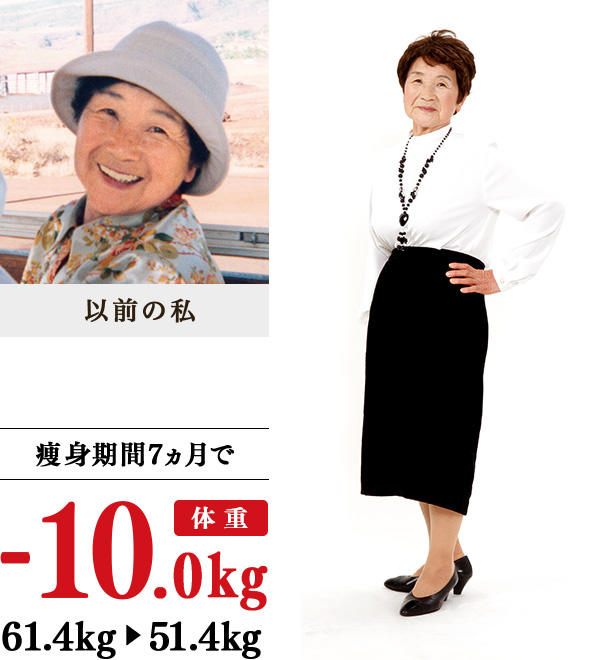 夫が亡くなり、28年間の介護生活に幕を降ろしたとき、私の体は体脂肪率40%以上、背中は丸くなり、大変な状態になっていました。娘たちの勧めもあり、孫が働いているイヴに入学。教室で施術を受けると、リンパトリートメントでは背中の丸みがとれ、筋肉運動施術では体がすごく引き締まり、骨盤ケアでは脚が伸びて体が軽くなるため、週1回の通学が楽しみでした。家では、卵、魚、肉、野菜、豆類をよく食べるようになり、10kg減に成功!80歳でも、背中が伸び、まっすぐ歩けるようになったことに驚いています。肌にもハリが出て、「若返った」とよくいわれます。