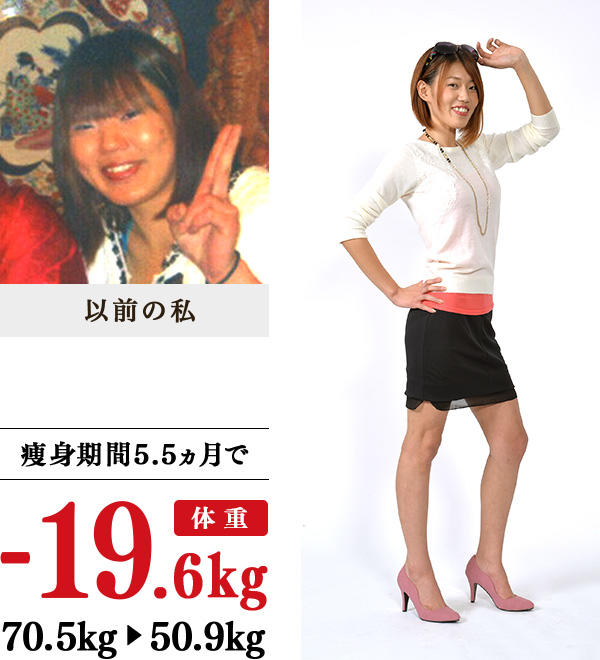 洋服はすべてメンズ物を着ていた私。サイズは、入学時19号から9号に激減し、ミニスカートも履けるようになりました。今まで自分に自信がなく猫背でしたが、姿勢もよくなり「カッコいい」といわれ、冗談かもしれませんが「モデルをめざすの!?」という嬉しい言葉も。こんなに痩せられるとは思っていませんでした。イヴに出会えて本当によかったです。これからも、更なる美を追究します。