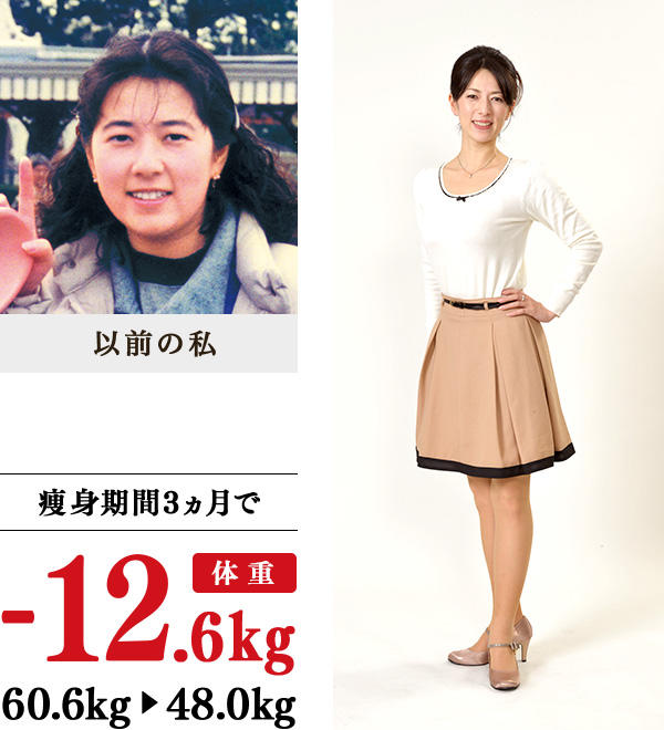 過食が原因で高校時代から太り始め、兄からは「トドちゃん」の呼び名。自己流痩身をしても継続や維持ができず、いつも後悔ばかり…。仕事用のパンツスーツにベルトが不要になったうえに、お腹の肉がはみ出したため、イヴに入学しました。教室で施術を受けるとたくさん汗が出て、むくみがとれ、脚もスッキリ!家では、朝食抜きをやめ、ミネラル摂取と、よく噛んで食べるように心がけ、半身浴やブラッシング体操、ストレッチも実行。ウエストが想像以上に細くなり、洋服は15号からどんなデザインでもOKの5号に!顔もスッキリし、「若返った」とたくさんの人にいわれています。
