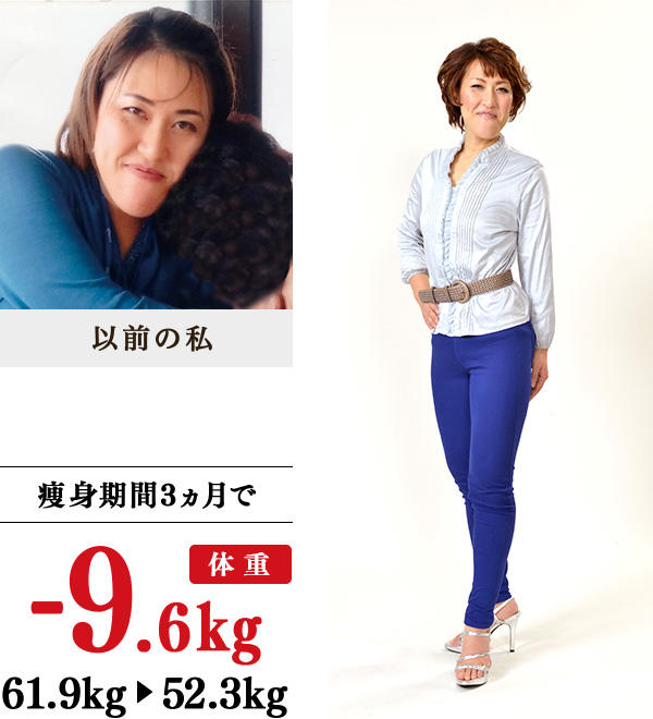 30歳過ぎから体全体に肉がつき、食事制限やウォーキングをしてもなかなか痩せられず…。静脈瘤がひどくなり、夫からもしつこく、「痩せたら」といわれ、悩んでいたときにイヴに出会いました。本当に痩せられるのか最初は不安でしたが、5回目に受けた骨盤ケア手技で、目に見えるサイズダウンを実感!家では、野菜をたくさん食べるように心がけたら、体調がよくなり、野菜のおいしさも再認識。大豆食品もよく食べ、半身浴やブラッシング体操も実行し、すごく女性らしいキレイなラインを手に入れることができました。悩みの脚も細くなったので、細身の洋服を楽しんでいます。