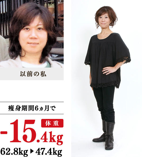 腰痛がひどくなり、ジムや加圧トレーニングに通い、痩せる努力をしたけれども成果が出ず…。きっと何をやっても痩せられないと諦めていたときにイヴに出会いました。教室は、皆一丸となって頑張ろうという雰囲気で、食事指導をはじめ、体についてのいろいろな知識も教わり、健康を意識して痩せる楽しみを学びました。また、その場だけ痩せればいいではなく、痩せたあとも健康第一に考えながら、維持していこうという考え方がとても気に入りました。痩せたら、腰痛がほとんどなくなり、股ずれもしなくなり、肌までツヤツヤに。洋服は、Mサイズは余裕で着られ、物によってはSサイズもOKに。周囲の人が皆、「若返った」と褒めてくれます。