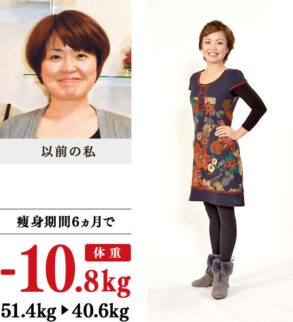 結婚して12年、毎年体重が1kgくらいずつ増加…。喧嘩をしたときに主人に、「ブタ」といわれ、危機感を覚えたため、イヴに入学しました。教室に行けば、その度に効果が実感でき、帰宅時にはパンツがユルユルになる施術もあり、楽しく通学!家では、食事量バランスを朝0:昼4:夜6から朝4:昼4:夜2に大改善し、筋肉量を増やすためにたんぱく質もとるように心がけ、半身浴や朝夜1回、飲み会の翌日は夜2回のブラッシング体操も実行。痩せたら、肩こりが少なくなり、疲れにくくもなりました。ぽんぽこ狸のようだったお腹がへこみ、洋服は5〜7号サイズになり、スキニーも履けるようになりました。