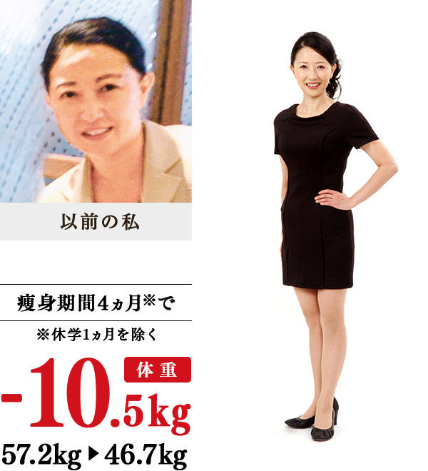 仕事のストレスを甘い物を食べて解消していたら、40代以降、急激に太り始め、友人から「お相撲さんみたい」、母からは「おばさん体型」といわれました。洋服が次々と着られなくなったので、広告を見て気になっていたイヴに入学。教室で施術を受け、家では、食事量バランスを朝0:昼4:夜6から朝4:昼4:夜2に変え、野菜、豆腐、もずくなどをよく食べるように。39℃での入浴と、飲み会の後は夜と翌朝2回ずつのブラッシング体操も実行。わからないことがあったら聞きやすい先生方の雰囲気と存在も痩身成功につながりました。痩せたら、階段を昇っても息切れしなくなり、顔もシャープに。洋服は、体にフィットする7号になり、ビキニにも挑戦しました。