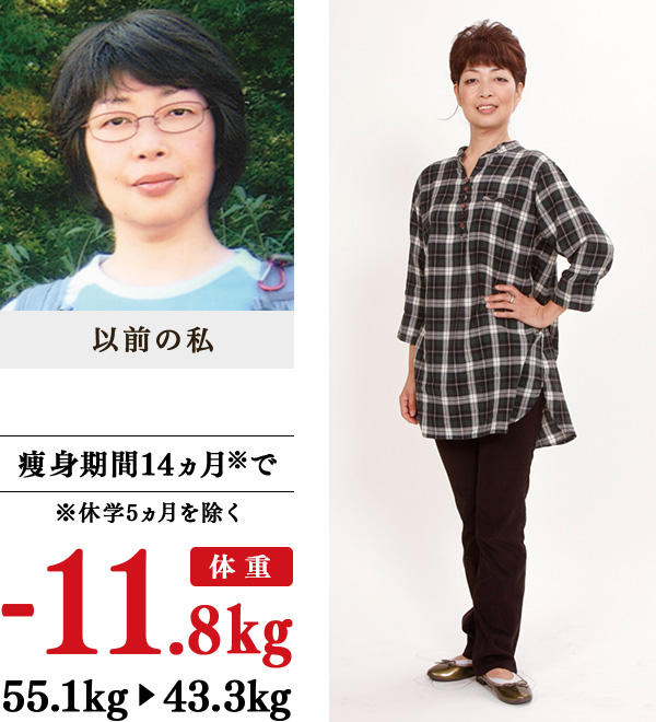 40歳までは、冬に太っても、夏には痩せて体重が戻っていたのに、その後は毎冬1kgずつ増え、ついに人生最大体重になりました。娘からは、「5段腹を初めて見た」の言葉…。バレエの発表会に出ることを家族に報告したら、「みっともない」といわれ、主人が電車広告で見たイヴを教えてくれました。教室で、冷えが改善されたり、背中や肩のコリが楽になる施術を受け、家では、夜は野菜を多めに食べ、ウエストを重点的にブラッシング体操も実行。着実に痩せていき、友人に、「会うたびに細くなる」「若返った」と驚かれながら、理想の体重&体型に変身できました。