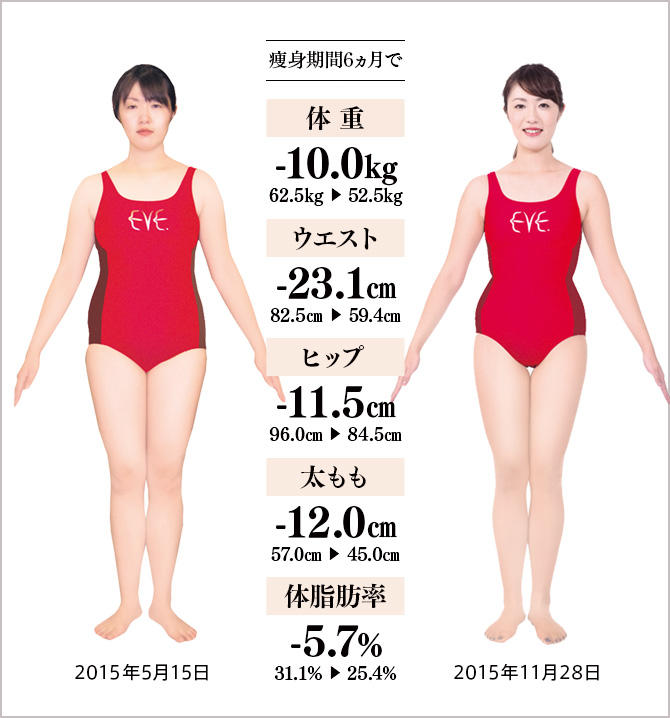 人に会うたびに、「太った?」と聞かれたことと、彼との結婚も近づいたため、キレイな姿でウエディングドレスを着たいと思い、イヴへ。先生たちは元気でフレンドリー、痩身技術を受ければ、1回の減量数が大きく、成果を実感できました。家では朝食欠食をやめて、朝食と昼食を多め、夕食を少なめにとるように心がけ、豆腐、煮物、鍋料理をよく食べました。また、夜の水分摂取を減らし、なるべく毎日半身浴をしたら、朝のむくみが軽減。最初の1ヵ月でスピード5kg減、いまでは、中学生時代の体重になり、体調もよくなりました。体重を落とすだけでなく、ボディラインもキレイに整えていただき、彼にも「スタイルがよくなった」と褒められました。