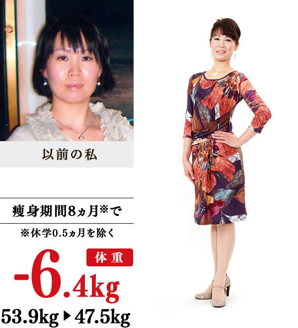 高校生の頃から肥満。ダイエット食品やエステで痩せてもリバウンド…。お稽古ごとの先生に痩せるようにいわれたため、発表会までに痩せようと思い、イヴに入学しました。イヴの先生方は、メンタル面にも気を遣いながら、一生懸命施術をしてくださり、施術後にはつまったリンパが流れている、引き締め、脂肪が溶けるなどの感覚がありました。家では、野菜をたくさんとる、体を冷やさないように温かい料理をとることを心がけ、ブラッシング体操も実行。痩せたら、腰痛が解消し、小顔&肌の状態もよくなりました。洋服は、7号やSサイズのスキニーも履けるように。腕も細くなり、仕事のユニフォームがゆるくなりました。