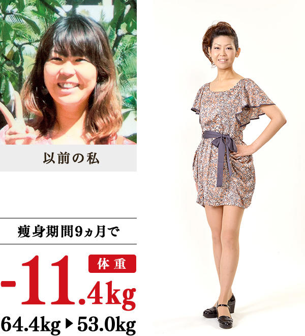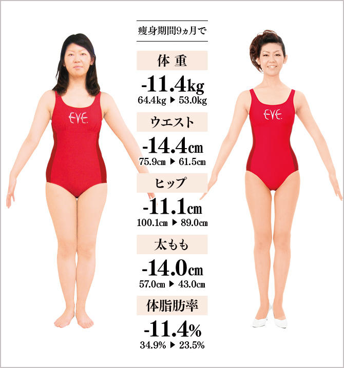 週3〜4回の飲酒が原因で3年前から太り始め、洋服が大好きなのに、試着にドキドキ、鏡を見てショック…。いろいろな痩身法を試したけれども長続きせず、体調を崩すこともありました。イヴには、「これで最後!」と決意を固めて入学したのですが、最初は汗がなかなか出ず、体重が落ちない日もありました。体調にあわせて行ってもらえる施術プラス、家でも、食事は温野菜をとったり、冷たい飲み物をとらないように心がけ、半身浴とブラッシング体操などのアドバイスを実行したら、発汗量が増え、体重も落ち、痩身意欲が高まりました。痩せたら、高脂血症が解消。洋服は、体のラインが出る9号に変わり、買い物を楽しんでいます。