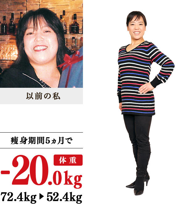 イヴ通い1ヵ月後に6.7kg痩せ、洋服は1サイズダウン。その頃、受けた健康診断では、1年前にやや高かった血圧が下がっていて、その他の数値もすべて標準値に!体が軽くなり、肩こりも少なくなったので整体にも行かなくなりました。通学14回目で10kg痩せた頃から、「脚がキレイ」といわれるようになりました。さらに痩せ、今では成人後最軽量の体重になり、洋服は17号から体のラインが見える9号に激変。太ももにすき間ができ、すれなくなったので、パンツも履くようになりました。