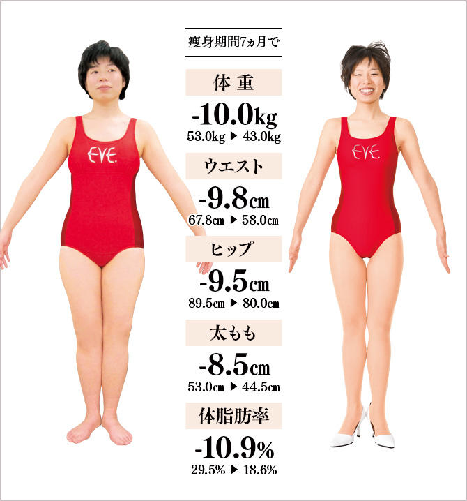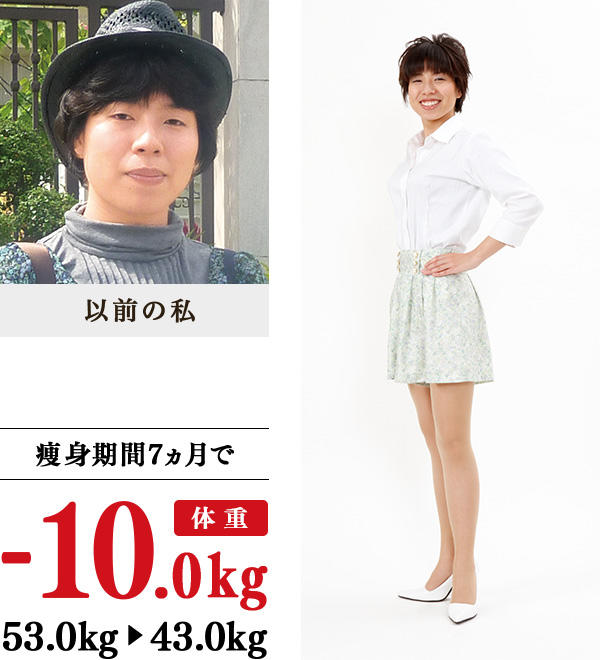 2年前、念願だった部署に配属され、アジア5ヵ国を船でまわるという約40日間の国際交流の業務を終えて帰国したら、体重が60kgに…。自力で5kgほど落としたあと、体重が落ちなくなったことと、どんな痩身法でも痩せなかった脚を細くしたいと思い、イヴに入学しました。教室で塩の手技を受けたら、いきなきウエストがくびれビックリ!家では、夏以外、気が向いたらやっていた半身浴を毎日行うようにし、ブラッシング体操も実行したら、悩みの太ももが細くなって、7号のショートパンツが履けるように。10kgも痩せたのに、バストは1サイズ落ちただけ。生理痛がとても軽くなり、吹き出物も減少し、肌もキレイになりました。