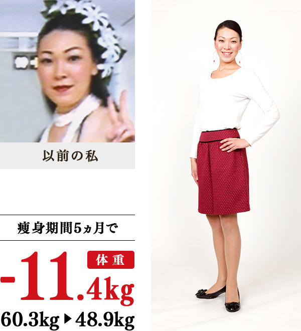 煙草をやめたら5kg太り、その後も35歳頃からどんどん体重が増加…。趣味のダンスをしていても、食事やお菓子をセーブしても痩せなくなり、ダンス衣装を着て鏡を見たときに、お腹や背中の肉が気になったため、イヴに入学しました。教室で施術を受けると、すごい量の汗が出て、1回で約1kg体重が落ちることにビックリ!家では、昼食のおかずを増やし、夕食は少なめにし、水分も控えるよう気をつけました。半身浴とブラッシング体操も実行したら、お腹がペタンコになり、太ももにすき間ができ、ショート丈も含め、パンツがキレイに履けるようになりました。肌がツルツルになり、顔色もよくなったことも嬉しいです。