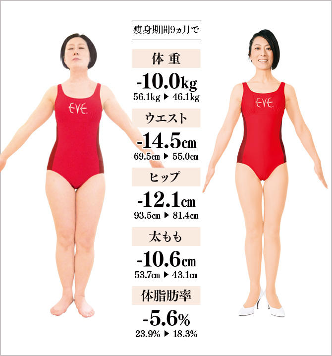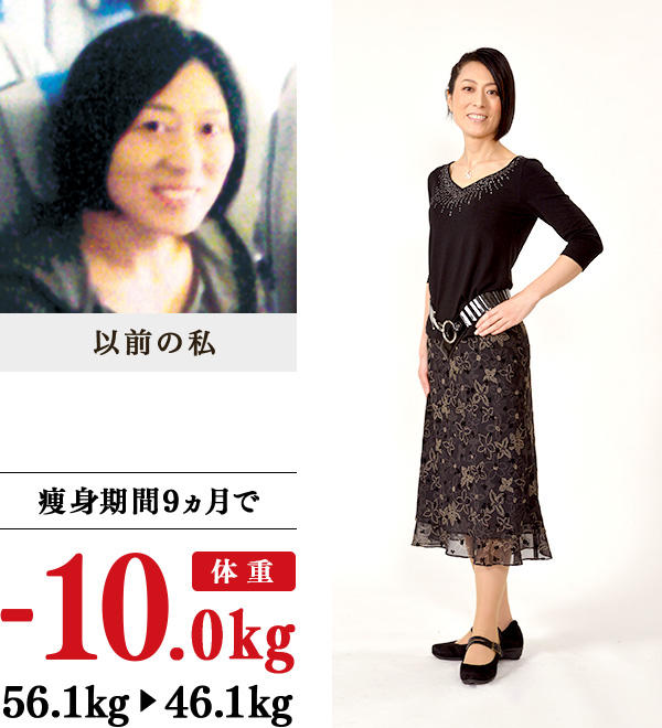 若い頃から下半身が太く、コンプレックスでした。3年半前の仕事の部署異動後から不規則な生活が続き、体重が大幅に増加…。私より食べているのにイヴで15kg減に成功した友人を見て、私も通うことにしました。最初の頃、施術後は、目が冴えて眠れなかったのですが、そんな私にあわせて施術を緩く調整していただけたことで減量達成まで続けることができました。家では、パン&麺食中心だったのをご飯に変え、お酒の量を減らし、ほとんど食べていなかった肉も食べるように心がけました。半身浴とブラッシング体操、ストレッチも実行し、痩せたら、今まで履けなかった念願の膝上スカートが履けました。体が軽くなったので、ジョギングも楽しんでいます。