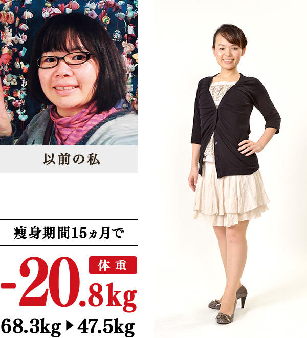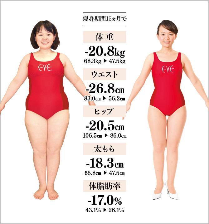 今までに経験した自己流痩身やエステでは、体重は減っても、体型は変わらず…。そんなときに出会ったイヴは、和気あいあいとした雰囲気で楽しく通え、先生との二人三脚で頑張ろうという気になりました。施術を受けると、体はポッカポカに。家では、朝食抜きをやめ、1日3食とるようにし、豆腐や納豆、スープをよく食べるようにもなりました。教室に通うにつれ、ウエストができ、お腹がペタンコになり、お尻から脚にかけても細くなり、体型変化を実感!痩せたら生理リズムが整い、階段が楽々昇れ、キビキビと生活が送れるようにも。洋服は、17〜15号から9〜7号に変わりました。
