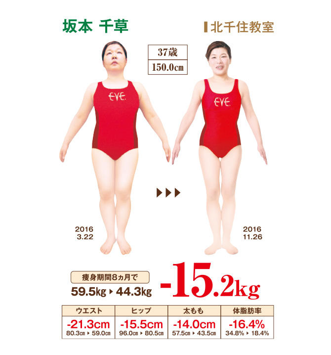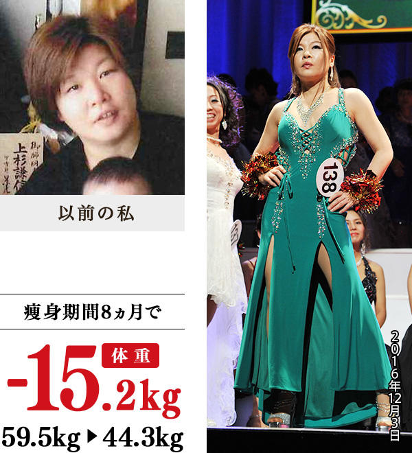 1年間で急に体重が増え、今まで着ていた洋服が着られなくなったり、着ても格好悪くなってしまいました。このまま体重が増えたら困ると思い、イヴに入学。温式痩身の教室を最初は暑いと感じましたが、少しずつ慣れてきたので、私の体が冷えていたのだと実感。自宅では、食事指導で朝食をパンからご飯に代え、フルーツも朝に食べ、夜は副食だけにし、温かいお茶を飲むように心がけました。生活面では、シャワーが入浴になり、入浴後にはセルフマッサージで脚のむくみもケア。少しずつ体重が減ればよいと思っていたのに、最初の3カ月で−10kgと予想以上に減量でき、1年前の体重に戻ったことに驚いています。さらに痩せ、中学時代の体重になりました。