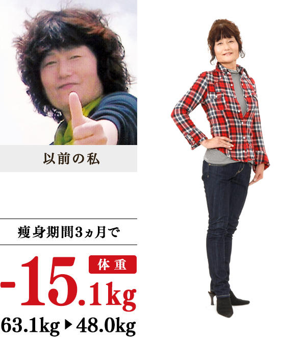40代半ばまで、ずっと51~52kgを保っていたので、太る体質ではないと思っていました。子育てが一段落したあと、近所の友だちの中華屋にパートで勤め始め、お昼においしいラーメンを食べ、ビールも飲むという生活が1~2年続いた頃から、少しずつ太り始めたような気がします。10kg痩せた頃から肌にハリが出てきました。カサカサ乾燥肌で、毎年冬は、爪の痕が残るくらい背中や脚を掻いていたのですが、イヴ入学後の冬は、それが一切ありませんでした。お嫁さんと気軽に始めた痩身エステ。楽しく通い、ここまで痩せることができ幸せです。