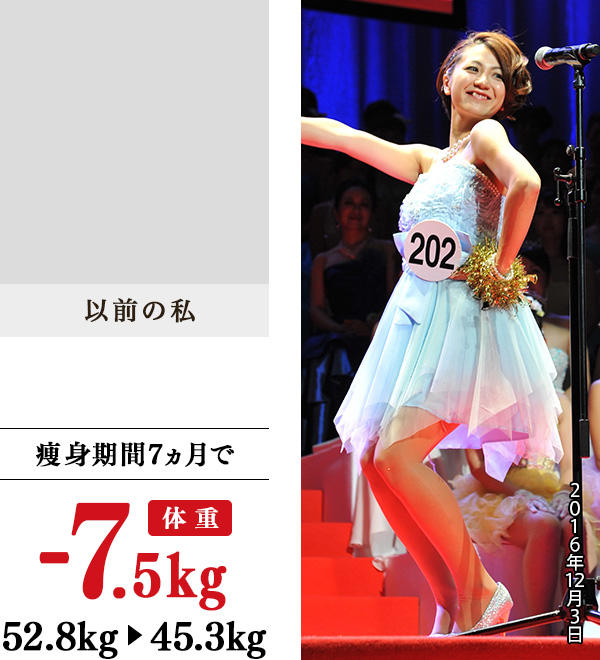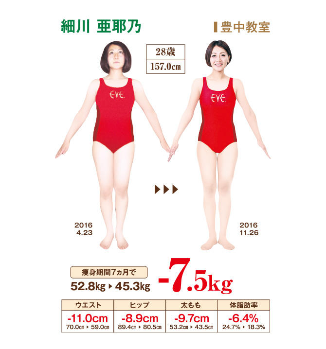 今までに何度もダイエットに挑戦したけれども、失敗の繰り返し…。「健康」という言葉に惹かれて訪ねたイヴは、先生たちが明るく、「一緒に感張りましょう」と励ましてくださる雰囲気が素敵だったので通うことに決めました。温式痩身の温かい教室でプロの痩身技術を受け、自宅では食事アドバイスで納豆やサラダをよく食べ、ホームケアのブラッシング体操は半身浴前に実行。−5kgを達成し、夢の40kg台になったときは、本当に嬉しく、大好きな海にビキニで行く夢も実現しました。さらに痩せ、友だちに、「誰?」「別人」といわれるくらい大変身!鎖骨が現われ、女性らしさがアップしたのも嬉しいです。