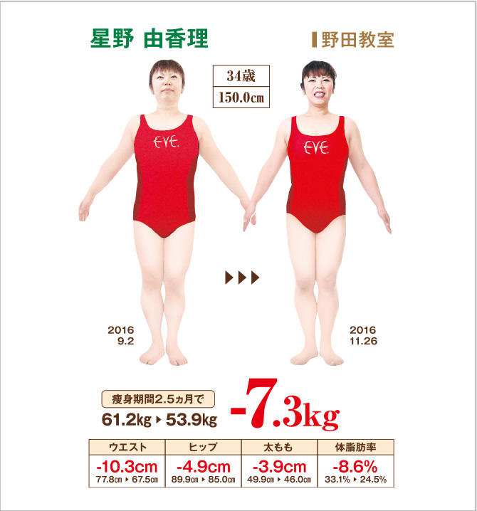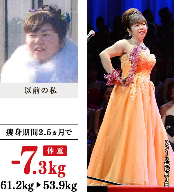 子どもの頃から肥満で、人生最大体重は20歳の頃の80kg。今回は、食事のカロリー制限をしてもなかなか痩せられなかったので、イヴに入学しました。温式痩身の温かい教室では、冷え性の体が温まり、手技で経絡上のビューティーポイントを刺激していただくと、便通が良好に。先生たちの食事アドバイスで、パンよりもご飯、他には肉、魚、野菜もバランスよく食べるようになり、ホームケアでは入浴時にイヴ伝授のブラッシング体操を実行。わずか2カ月半で中学生時代の体重に戻り、体が軽くなったら、運動ができるようになり、肌質まで変わりました。イヴ入学前に入籍をしていたので、もう少し痩せて、ウエディングドレスと和服を着て、写真を撮りたいです。