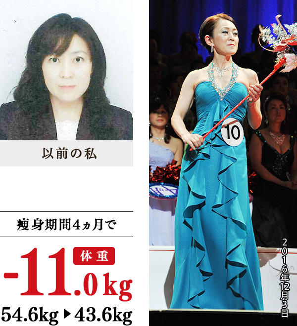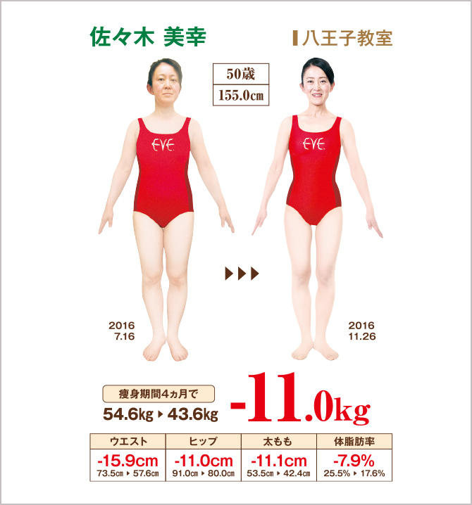 きっかけは、高校と大学時代の2つの同窓会。少しでもキレイになって旧友に会いたいと思い、イヴに通うことにしました。教室で痩身技術を受ければ、「必ず痩せる!」と実感。食事は、食べないダイエットで痩せた経験があったため、「食べると太る」と考えていましたが、先生たちには逆にご飯類を食べるように勧められました。さらに、シャワーを入浴に変えるなど、生活習慣も改善。同窓会のときは、少ししか体重が減っていなかったのですが、お洒落をして出席できました。その後、中学生時代の体重まで痩せたら、五十肩で痛かった左肩が楽になったのも嬉しいです。