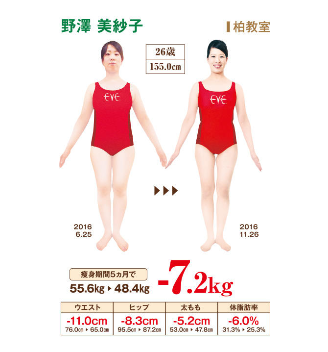 部活をやめた高校の頃から太り始め、一番痩せていたときよりも体重が10kg増加。いろいろなダイエットを行いましたが、太ったり、痩せたりの繰り返し…。好きな洋服が買えなくなったことと、娘連れでウエディングドレスを着たいとも思い、イヴに入学しました。他の生徒さんもいるオープンフロアの教室ではやる気がアップ!自宅では、たんぱく質や野菜を使った汁物メニューを増やし、ホームケアで半身浴前に行っていたイヴ伝授のブラッシング体操は、外食した日はお腹を多めに実行。通学7回で5kg痩せた頃から脚や腕の冷えをあまり感じなくなり、軽くなった体で高校時代にやっていたバドミントンにも挑戦しました。今は資格取得に向けて勉強中です。