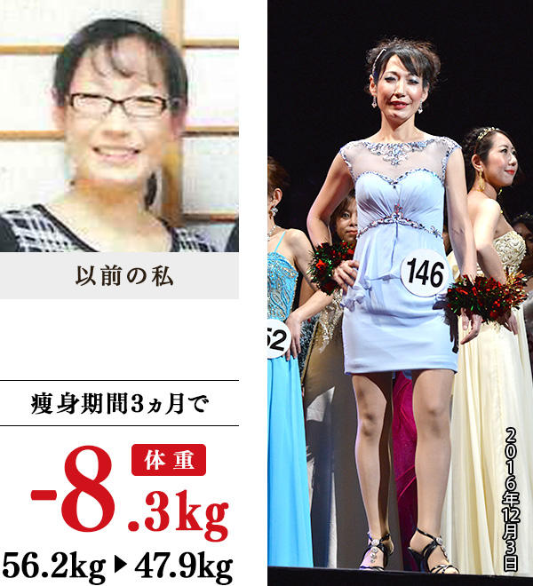 1年前から体重が増え続け、20代の頃より6kgオーバーに。とくに、お腹、ヒップ、太ももなど、下半身が気になっていました。これ以上、醜くなりたくない、年齢的にも、健康的に、キレイに痩せたいと思い、インターネットでいろいろ調べていたら、いちばん理想的な条件がそろっていたのがイヴの北千住教室でした。体験プランだけでは目標達成ができないと感じたため、入学。食事時間は仕事柄、不規則で改善できませんでしたが、先生たちのアドバイスで、しょうがを料理に活用するように心がけました。美とかけ離れた介護の職場で、日々奮闘中の50歳の私が、イヴの魔法で、短期間で20代の頃の体重に戻りました。