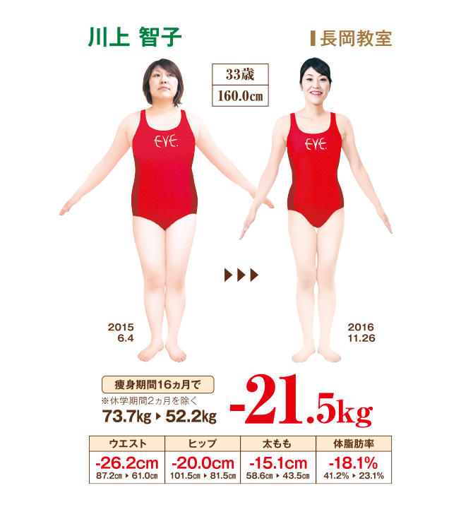 以前、挙式前にイヴに通い、着たいドレスで挙式ができました。けれど、2度の出産後、体重が戻らず、鏡に写る姿はパンパン…。再びイヴに入学しました。温式痩身の温かい教室で汗をかくことは大切なことですが、大変さもあります。でも、地道に頑張れば痩せられるのだと実感。自宅では、食事指導で卵やチキンなどのたんぱく質を積極的に食べ、飲み物はホットを心がけました。ホームケアのブラッシング体操は半身浴時に実行。最初の9回で−5kg、29回で−10kg、さらに痩せ、小学生時代の体重に戻りました。洋服は17号から9号に、指輪まで13号から7号にサイズダウン。会社の人に「どんどん若々しく、キレイになっている」といわれたのも嬉しいです。