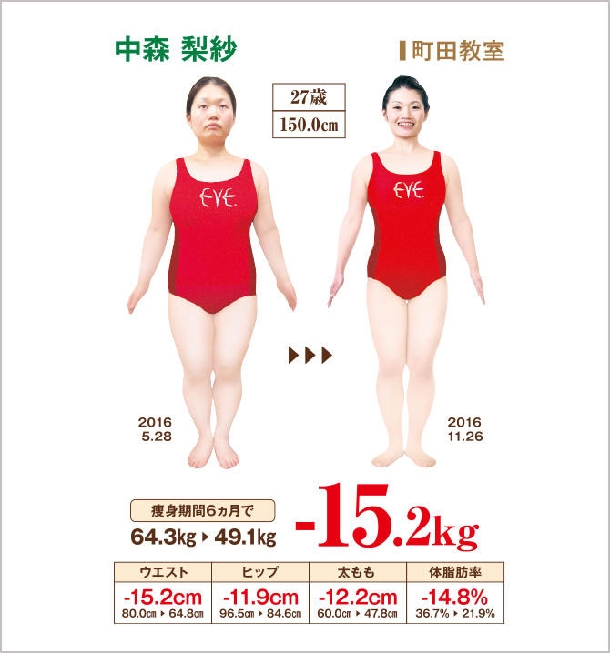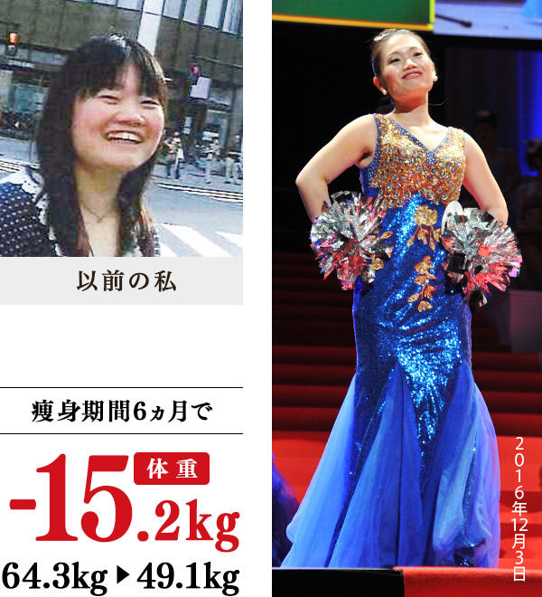小学校6年生で68kg、高校卒業時には74kg。太ったまま30歳になるのかと思うと、将来の結婚や健康に不安を感じ、初詣で「今年こそは自分を変える!」という目標を掲げました。ジムでトレーニングをしたけれども、パン、肉、お菓子が大好きなせいか、太る一方…。そんなときにイヴを知りました。汗をかきやすい私は、温かい教室で痩身技術を受けると、最大3kg体重が落ち、終了時は体がスッキリ!食事を夜中心から朝昼中心に変える、寝る前に必ずもみほぐしかストレッチを行うなどのアドバイスも実行したら、固かった脂肪が柔らかくなり、体重も徐々に落ちました。短期間でこんなにキレイに痩せたのは初めて。イヴには本当に感謝しています。