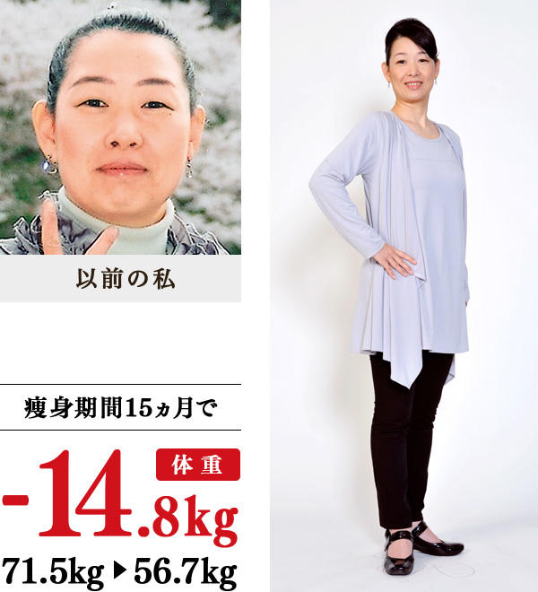 19歳頃から太り始め、漢方や単品ダイエット、水泳など、あらゆる方法を試し、10kgの増減を25年繰り返してきたら、体の半分近くが脂肪という状態に…。痩せるだけでなく、汗をかける体になりたい、肩こりを軽減したいと思い、イヴに入学。料理が苦手で、外食や市販の弁当や惣菜を食べることの多い私へのアドバイスは、朝食は家でご飯を食べるように、惣菜を買うときには青菜類も買うようにというものでした。甘い物も大好きで、おやつやスイーツバイキングのお誘いにはすべて付きあいながら、約15kg減に成功!食事アドバイスも他の人と同じではなく、私の食生活のリズムにあわせて行っていただけたことも成功のポイントです。