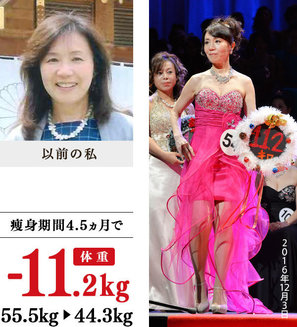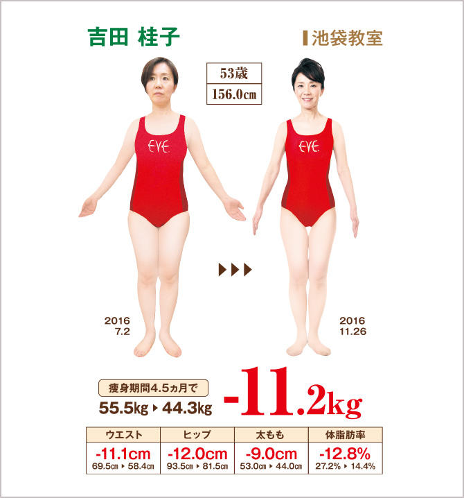 趣味はマリンスポーツ。海に行ったときに体型が気になりつつも、小学校6年生から太っていたため、仕方がないと思っていました。でも、50歳を過ぎたときに、「まだ遅くない!」と一大決心をし、イヴの扉をたたきました。教室の温かさは、寒さが苦手で冷え性の私にはぴったり。先生たちは、優しく、気づかいもあるので、居心地がとてもよく、安心して通えました。自宅では、食事アドバイスで白米を玄米や押し麦、キヌアに代えたり、低糖質、高タンパク食も意識。ホームケアのブラッシング体操は、朝や半身浴前に、1つ1つの動きを大きく、しっかり行いました。通学10回で−5kg、24回で−10kgを達成し、「小顔」とよくいわれるようにもなりました。
