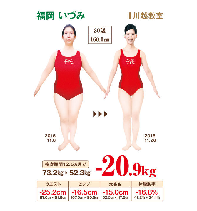 好きな物を好きなだけ食べていたら、アッという間に78kgに。洋服を試着すらできず、自力でダイエットをしたけれども2〜3kgの減量が限界…。そんな私が、イヴに通い始め、温式の教室で体を芯まで温めると、みるみる代謝がよくなるのか、驚くほど汗が出て、元気になりました。通うたびに先生たちから新しい情報やアドバイスもいただけたので、常に新鮮な気持ちで通学。15kg痩せたときに受けた健康診断で、「1年足らずでよく頑張った」と褒められ、その頃、彼氏もできました。20kg減量後は、会社の制服が19号から9号に5サイズもダウン!イヴは、ただ痩せるだけではなく、先生や他の生徒さんとの絆も感じられる、温度も心もホットな教室でした。