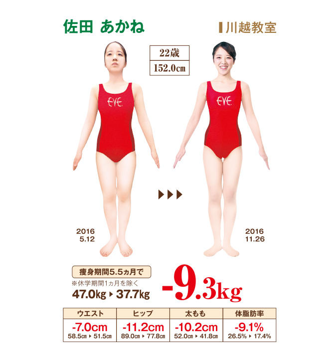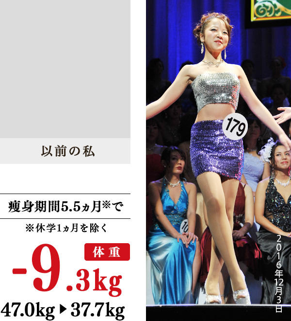 ずっと自分の太い下半身が嫌いでした。就職活動を終えたことを機に、最後の学生生活を無駄にしたくない、自分に自信をもって社会で出たいと思い、イヴに通い始めました。1カ月半でみるみる5kg痩せ、趣味のダンスで、露出の多い衣装で、自信をもってステージに立ちました。ビキニを着れば、体の細さに驚きの声。そんな優越感に満足し、油断した私は、その後リバウンドし、痩身を諦めようとまで思いましたが、自分一人ではわからないことをアドバイスし、解決してくださる先生がいたことと、5kg痩せたときの成功体験を思い出して、もう一度頑張ろうと奮起。その結果、小学生時代の体重に戻りました。イヴは私の人生を明るく変えてくれた場所です。