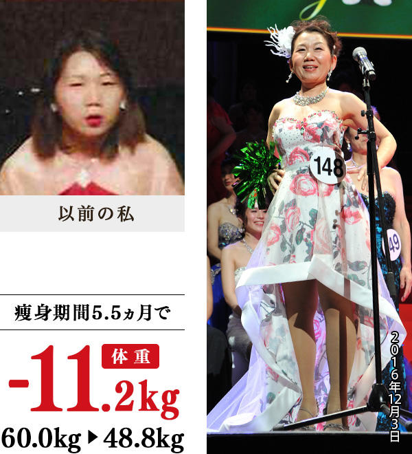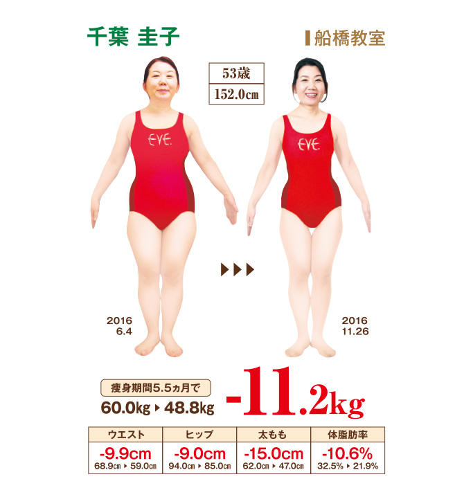 毎年、健康診断前に食事コントロールなどで体重を58kg前後から54kgくらいまで落とすことができていたのに、2016年に過去最大の60kgになり、今までと同じ食事コントロールでは体重が落ちなくなりました。そんな私が、イヴでは体験1回で体重が落ちたため、入学。元々体温が低めのため、教室の暑さは苦手でしたが、通学を重ねたら慣れてきたので、体質が変わってきたように感じています。一人ひとりの肥満状態や体質にあわせ、目的を伝え、私たち生徒が納得したうえで行ってくださる痩身技術も素晴らしく、だからこそ成果が出るのだと実感しながら、中学生時代の体重が復活。手脚の冷えがやわらいだのも嬉しいです。