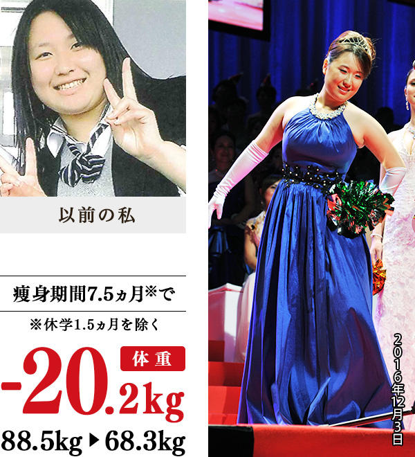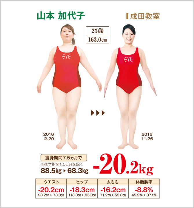 中学3年生以降、食事制限やウォーキングで痩せたり、太ったりを繰り返してきました。イヴへ入学したのは、季節ごとに風邪をひくくらい免疫力がなくなったことと、元々弱かった腰がついに腰椎椎間板ヘルニアと脊椎狭窄症になったため、人生最後のダイエットを決意したからです。冷えて、凝り固まった私の体のつまりをほぐす痩身技術では、痛みも感じましたが、ラインができるので、「すごい!」と実感。先生や他の生徒さんとの会話も、よい刺激になりました。7カ月半で高校1年生頃の体重に戻り、スキニーパンツのようなピタッとした服装ができるようになりましたが、まだ最初に設定した目標体重に達していないので、さらに痩身に励みます。