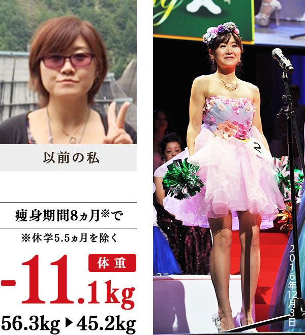 スポーツで太くなった下半身。さらに、車の事故で動けなくなったことで、上半身まで太ってしまいました。好きな洋服を着たときに、ボディラインが気になったので、イヴに入学したのですが、一番変わったのは、食事指導で朝食を食べるようになったこと。野菜や、のり、もずくなどの黒い色の食材、しょうがをよく食べるようにもなりました。5kg痩せた頃から太ももにすき間が現れ始め、10kg減量後は生理痛が楽になり、ビキニにも挑戦。なりたかったモデルのような体型を手に入れることができました。下半身がむくまなくなり、脚も疲れにくくなったので、山登りや水中ウォーキングを楽しんでいます。