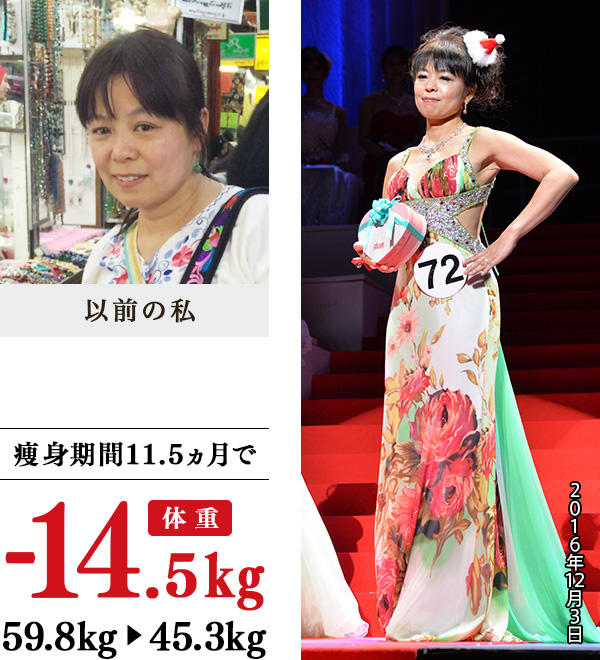 3年前に交通事故にあい、普通の生活ができない辛い気持ちを食べることで紛らわせていたら、人生最大体重に…。動けるようになったときに、偶然、イヴの看板が目に止まり、訪ねました。温かい教室で汗をかくことが気持ちよく、ボディケアし ていただければ、さすがプロと感じる技術力。食事指導で、欠食していた朝食を食べるようになり、麺よりもご飯中心にし、しょうがも活用。ホームケアのブラッシング体操は、朝の着替え前や半身浴前の他に、手が届くところにブラシを置き、時間があれば実行。最初の通学9回で−5kg、その後、8kg痩せたときには、ホテルのプールでビキニで泳ぎ、感動!食に興味がわき、資格取得に向けて薬膳の勉強も始めました。