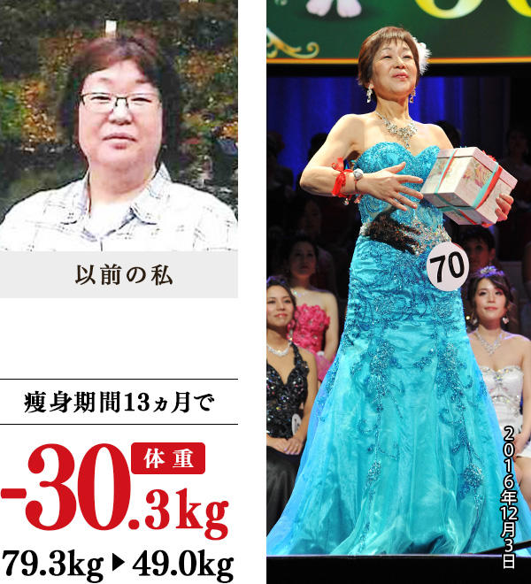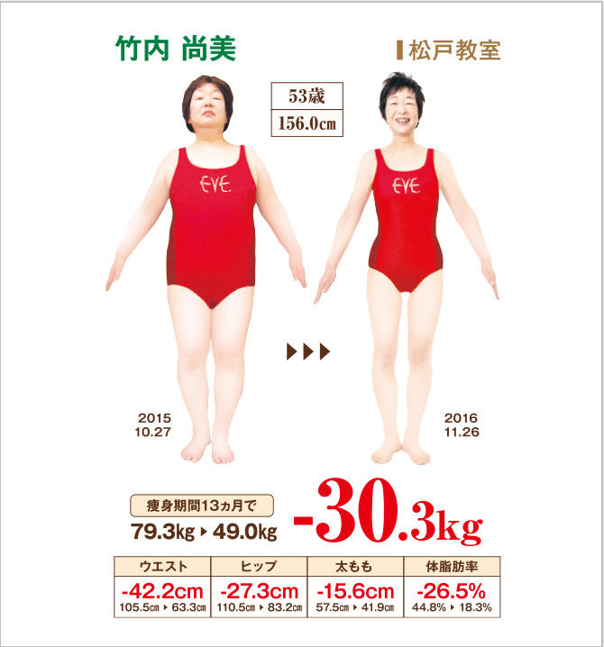 2人目出産後から体重が増え、とくにお腹まわりが太く、喪服が着られなくなったため、イヴに入学しました。最初はオープンフロアの教室で体を人に見られることが恥ずかしかったのですが、慣れてくると、他の生徒さんがキレイに痩せるうえでの目標になりました。痩身技術を受ければ、汗の量に驚きながら、自己流では絶対無理なくびれや脚のすき間が誕生!自宅では、和食中心の食事と白湯、ホット紅茶、しょうがなどを積極的にとり、イヴオリジナルのブラッシング体操はお腹を重点的に実行。最初の9回で−5kg、25回で−10kg、さらに痩せ、結婚当初の体重に戻りました。イヴは減量だけではなく、生活全般の見直しと意識改革をさせてくれる教室です。