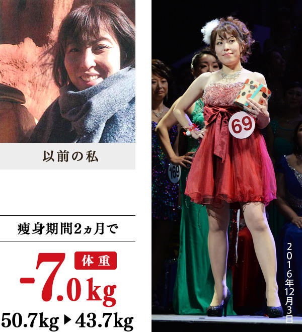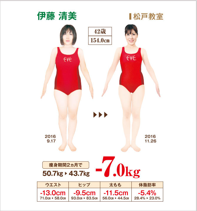 2年前の休職中に、運動不足と食事量が増えたことで、人生最大体重のお腹が風船のような体型に…。子どもに何度も、「デブ」といわれ、洋服はウエストラインが目立たないものばかり。引きこもりがちにもなりました。イヴの温かくて、健康によさそうだと感じた教室へ行けば、体重がダウン!自宅では、先生たちの食事アドバイスで、油料理を控え、納豆を今までより積極的に食べるようになりました。長めの入浴やイヴオリジナルのブラッシング体操などのホームケアも心がけたら、太る前の30代半ば頃の体重に。周囲の人に、「華奢」「笑顔が可愛い」といわれるのも嬉しいです。何歳になっても人は変われます。イヴに出会えてよかったです。