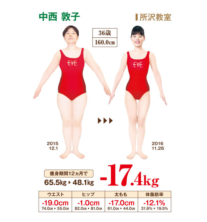 10年くらいジムに通っていますが、そこで体重測定をしたときに、「自力では痩せられない」と限界を感じたため、数年前から広告で見ていたイヴを訪ねました。初めてのエステで最初はドキドキしましたが、オープンフロアで教室全体が見えることが安心感につながり、同じ空間に他の生徒さんがいるのでやる気も出ました。室温の高さも私にはあっていて、発汗も気持ちよく、体を温めることの大切さを実感。健康的にキレイに痩せることを考えたハイレベルな痩身技術を受けたあとは、体がスッキリ!自覚がないくらいスムーズに小学生時代の体重まで痩せ、脂肪の塊のようだった太ももも細くなりました。自分にあった痩身法に出会え、本当によかったです!
