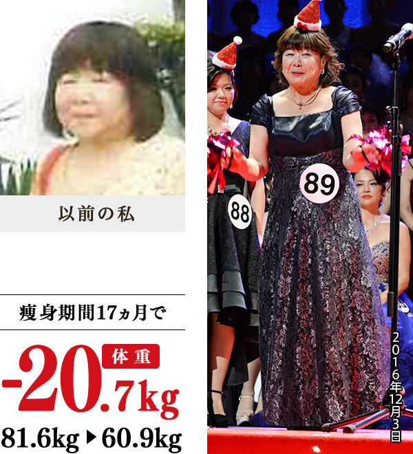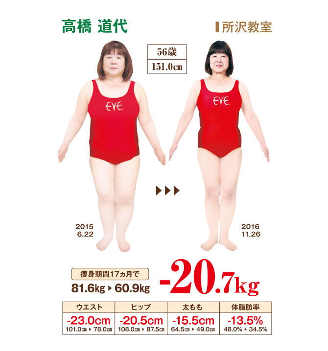出産後から太り始め、全体的にドボ〜ンとした体型に。50歳過ぎから、腰、膝が痛みだし、通院していました。ジムに3カ月通い、5kg減量できたけれども、膝が痛み、やめたらリバウンド…。人間ドックの結果も悪かったのでイヴに入学しました。温かい教室に入ると、すぐに汗が出て、「痩せられる!」と実感。自宅では、先生たちのアドバイスで、朝2:昼3:夜5だった食事量バランスを朝4:昼4:夜2に代え、水分のとり過ぎに気をつけ、ホームケアのブラッシング体操は入浴前に実行しました。通学9回で−5kg、24回で−10kg、さらに痩せ、30年以上前の結婚当初の体重になったら、腰、膝の痛みがなくなり、走れるように!イヴに出会えて本当によかったです。