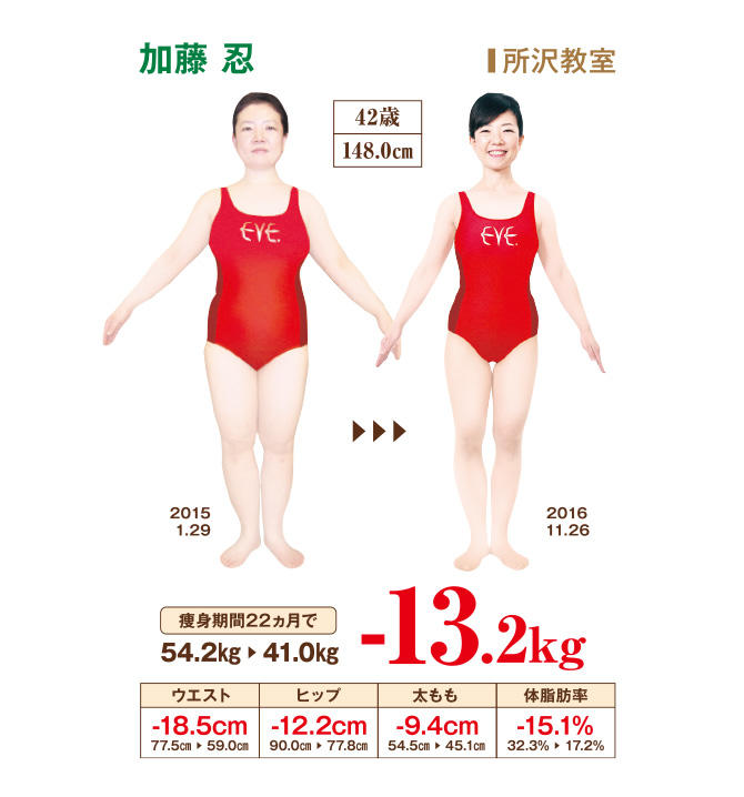 会社の健康診断で、「この先、危険です」、さらに後日、万歩計を渡され、「歩いてください」といわれたのを機に、イヴに通うことにしました。最初は温かいトリートメント室にびっくり。通ううちに、体を温めながら、先生たちが丁寧に行ってくださる痩身技術を受けることで、確実な成果が出るようになりました。自宅では、食事アドバイスで、野菜を先に食べるように心がけ、しょうが湯や白湯を愛飲。5kg痩せた頃から、洋服に余裕が出てきて、10kg減量後は水着が着られるようになりました。さらに痩せ、20歳頃の体重になったら、体型も180度変化。13kg以上も痩せたのに、体調はよいままなので、「本当に健康やせなんだ!」と実感しています。