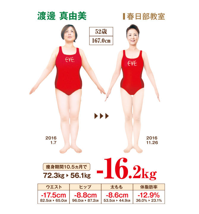 今までに、プロテインダイエット、サプリメントなどで最高40kg落としたけれども、リバウンドで15kg増え、さらに自己流で5kg痩せたところで限界に…。再婚を前に、彼のためにも、自分のためにも、健康でいたいと思い、イヴに通う決意をしました。温式痩身の温かい部屋に入るとすぐに汗が出て、毎回、必ず体重がダウン。痩身技術を受ければ、スッキリラインができました。自宅では、イヴの生徒手帳に書いてある、その時期に食べるとよい食材を料理に活用し、薄味も心がけたら、通学5回で−5kg、20回で−10kg!さらに痩せ、目標以上の体重と脚のラインになりました。負のスパイラルを脱出するには、専門知識を持つ方との痩身がお勧めです。