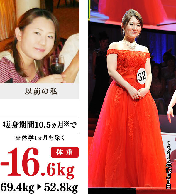 就職後、暴飲暴食の日々が続き、気づけば50kgだった体重が70kg近くに…。マズいと思い、イヴに通い始めました。最初の体験のときから先生たちは本気で、丁寧にいろいろ教えてくださり、本物と感じた技術力で体重もダウン。痩身プログラムをあまり型にはめず、体調にあわせて、時間や順番を臨機応変に変え、毎回減量結果が出るように配慮してくれたのも嬉しかったです。自宅では、毎日の食事量バランスを朝0:昼2:夜8から朝4:昼4:夜2に変え、調理方法もゆでる、蒸すに改善。質のよい睡眠も心がけました。20歳頃の体重まで痩せたら生理リズムが整い、肌もキレイに!モテるようにもなりました。イヴは信用、信頼できる本物の痩身教室です。